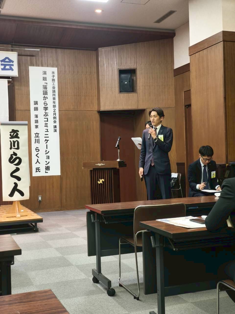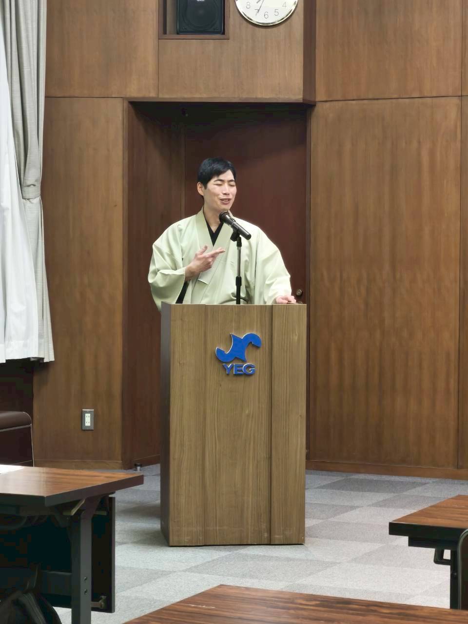 本例会では、米子市出身で落語家の立川らく人様を講師にお迎えし、「落語から学ぶコミュニケーション術」と題してご講演いただきました。私たち青年経済人にとって必要な「伝える力」「聴く力」「場を和ませる力」を学ぶことを目的としたものです。